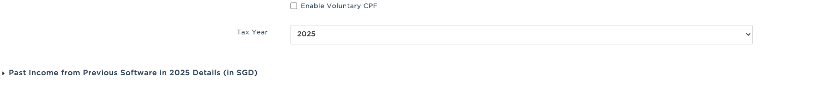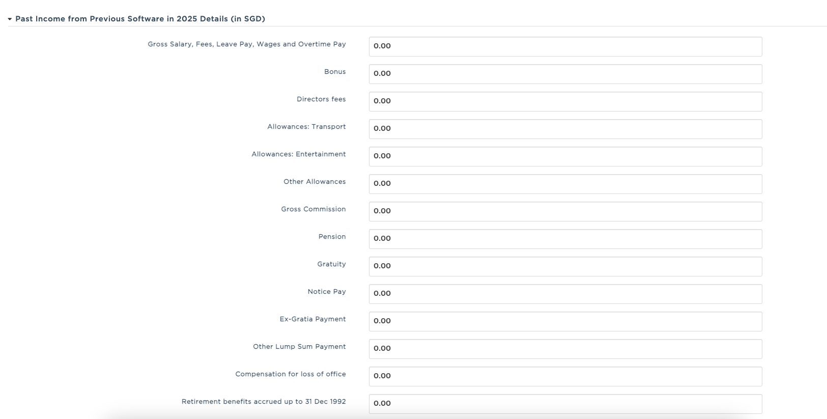 5. Expand the Past Income from Previous Software in 202X Details (in SGD) section and enter the year-to-date payroll details from the previous software.